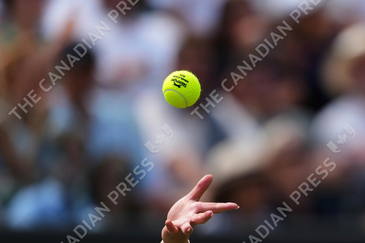 Amanda Anisimova of the U.S. serves during her women's singles third round match against Dalma Galfi of Hungary at the Wimbledon Tennis Championships in London, Friday, July 4, 2025.(AP Photo/Joanna Chan)
