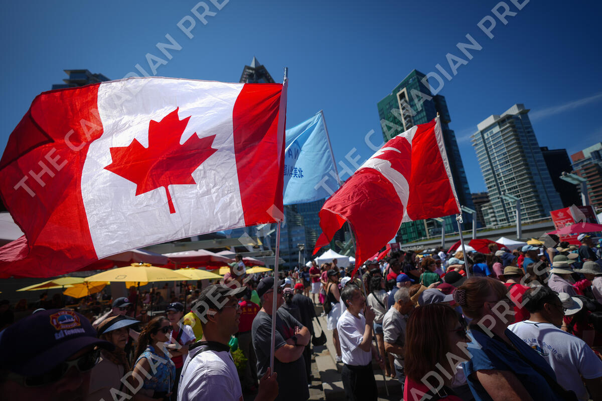 Canadian flags being held by people flap in the wind during Canada Day festivities in Vancouver, on Tuesday, July 1, 2025. THE CANADIAN PRESS/Darryl Dyck