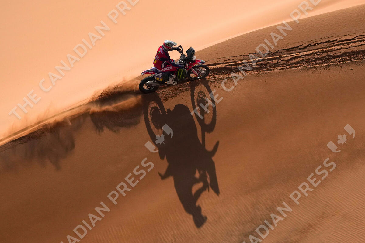 Rider Ricky Brabec competes during the eighth stage of the Dakar Rally between Al Duwadimi and Riyadh, Saudi Arabia, Monday, Jan. 13, 2025. (AP Photo/Christophe Ena)