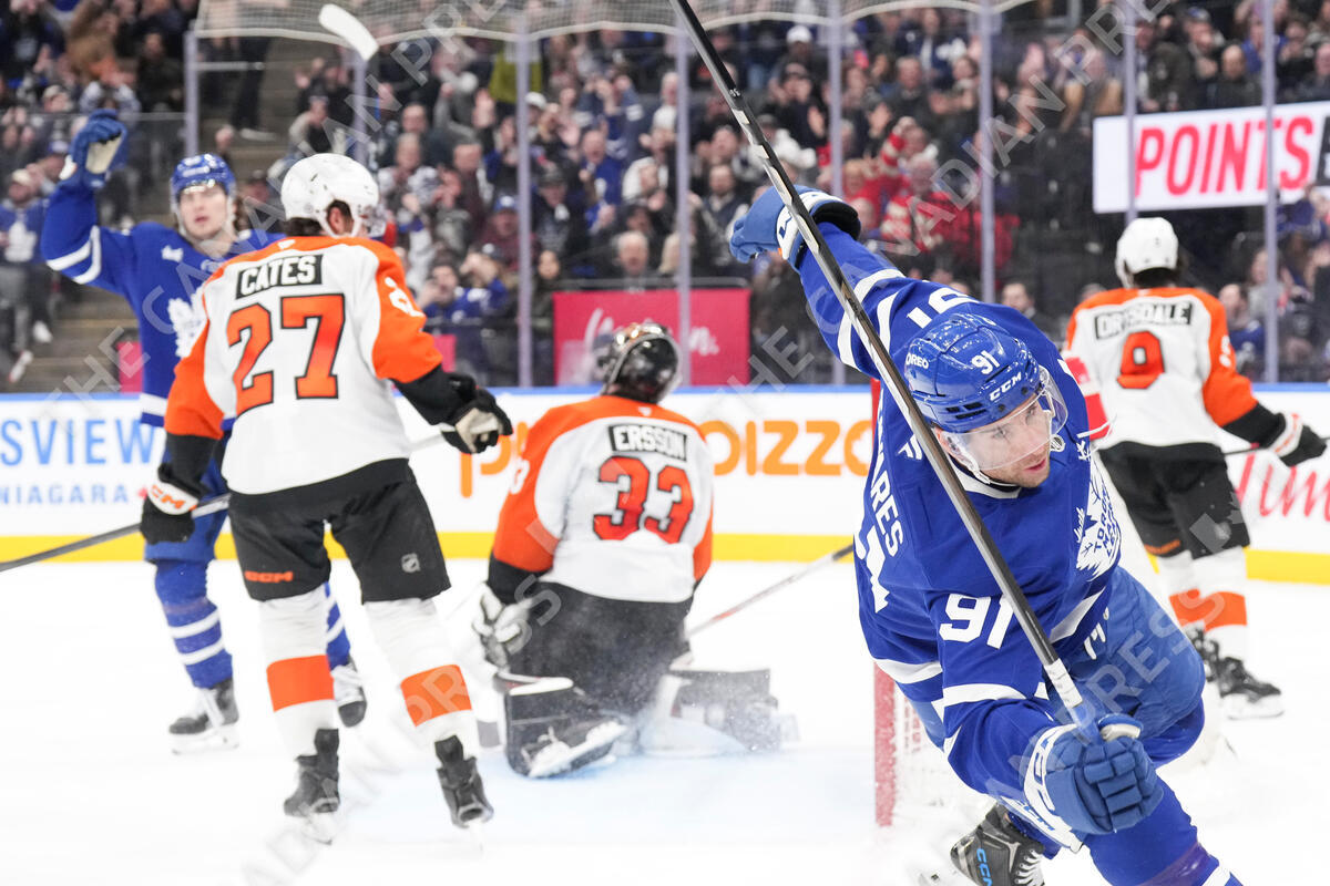 Toronto Maple Leafs' John Tavares (91) celebrates after scoring on Philadelphia Flyers goaltender Samuel Ersson (33) during second period NHL hockey action in Toronto, on Tuesday, March 25, 2025. THE CANADIAN PRESS/Chris Young