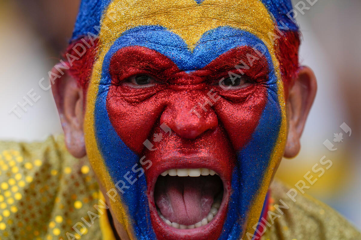A Colombia fan cheers before the start of the World Cup 2026 qualifying soccer match against Paraguay at Metropolitano Stadium in Barranquilla, Colombia, Tuesday, March 25, 2025. (AP Photo/Fernando Vergara)