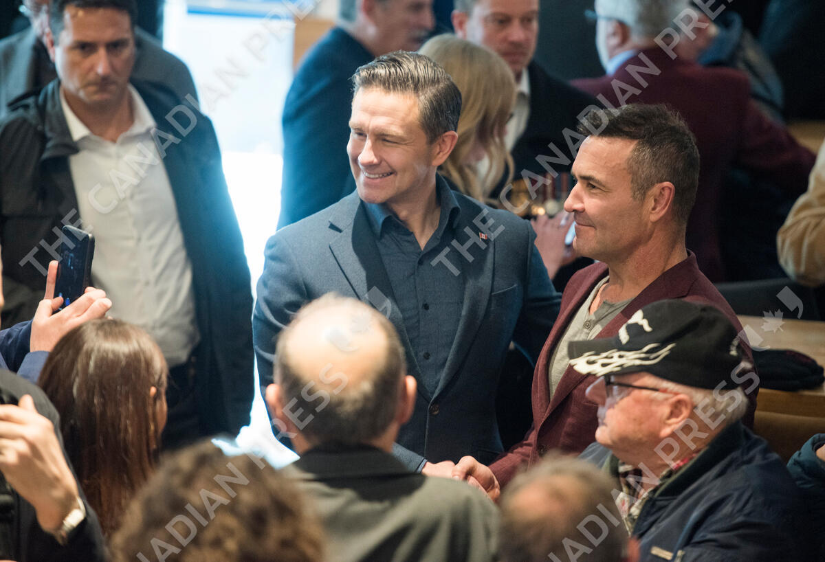 Conservative Leader Pierre Poilievre poses for a photo with a supporter during a campaign stop at a bar in Fredericton, N.B., on Monday, March 31, 2025. THE CANADIAN PRESS/Stephen MacGillivray