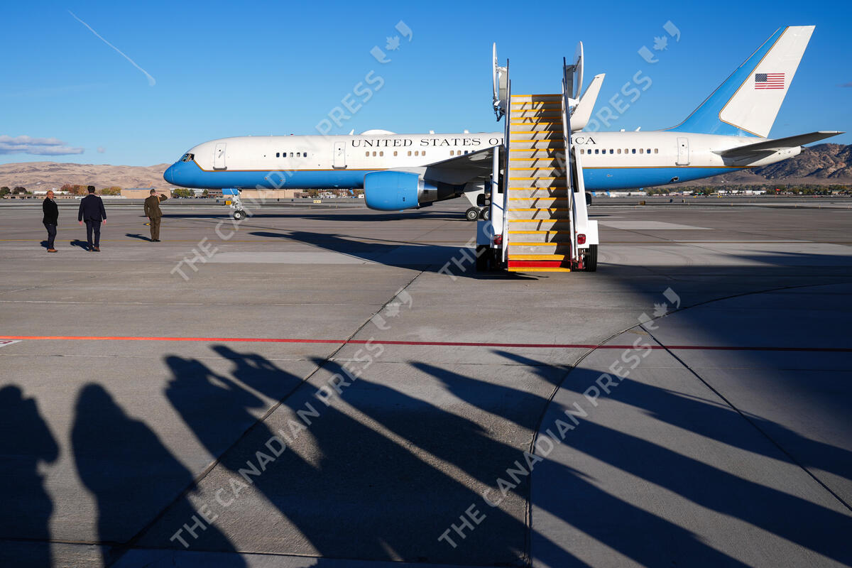 Media members cast shadows on the runway as Air Force Two, with Democratic presidential nominee Vice President Kamala Harris on board, arrives at Reno-Tahoe International Airport in Reno, Nev., Thursday, Oct. 31, 2024. (AP Photo/Susan Walsh)