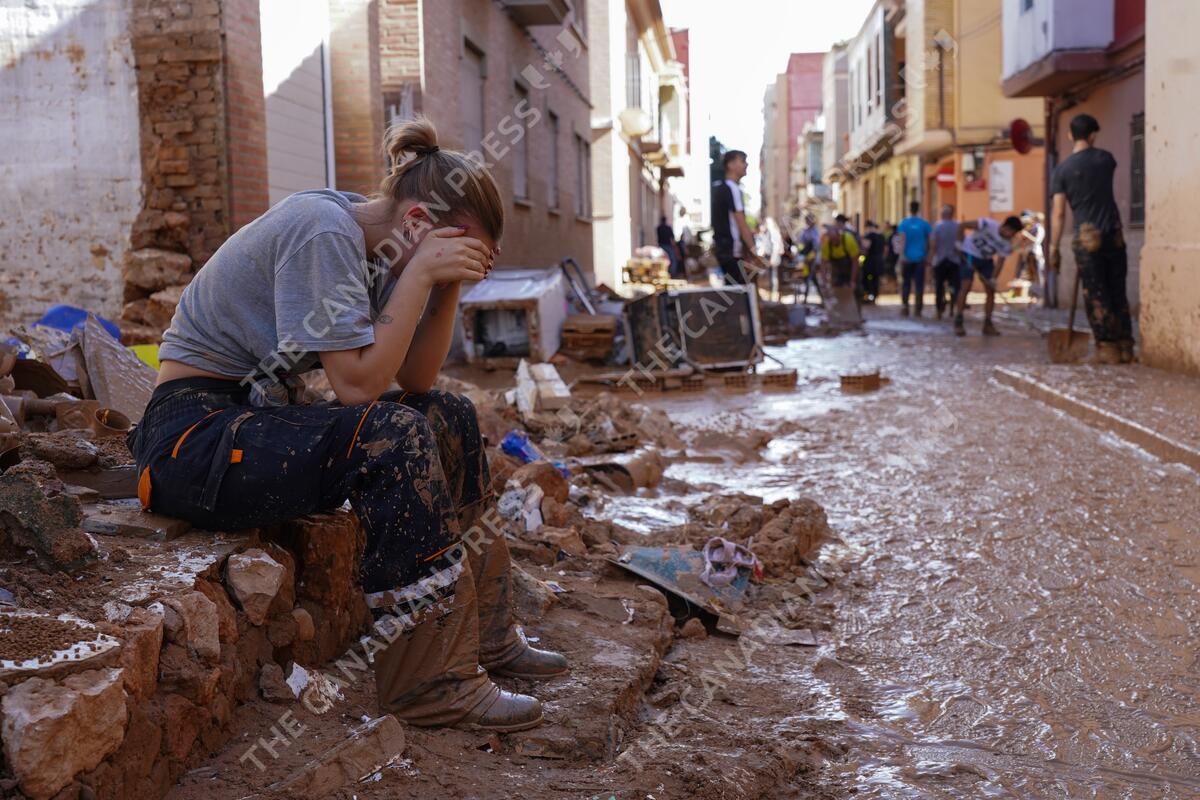 A woman rests as residents and volunteers clean up an area affected by floods in Paiporta, near Valencia, Spain, Friday, Nov. 1, 2024. (AP Photo/Alberto Saiz)