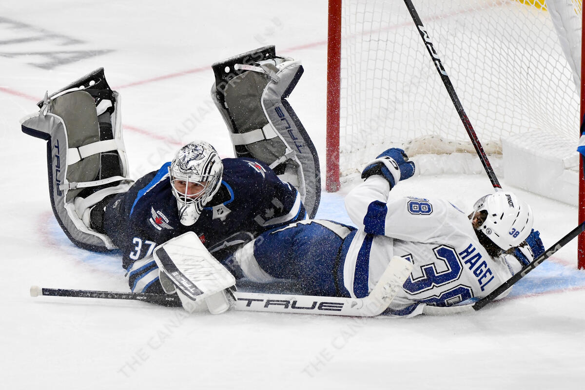 Tampa Bay Lightning's Brandon Hagel (38) collides with Winnipeg Jets goaltender Connor Hellebuyck (37) during third period NHL hockey action in Winnipeg on Sunday November 3, 2024. THE CANADIAN PRESS/Fred Greenslade