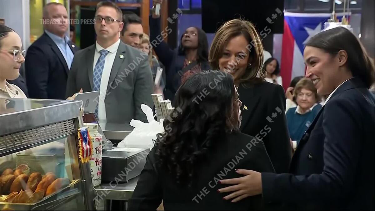 Vice President Kamala Harris visits Puerto Rican cafe, knocks on voter's door in Reading, Pennsylvania, on the eve of Election Day.