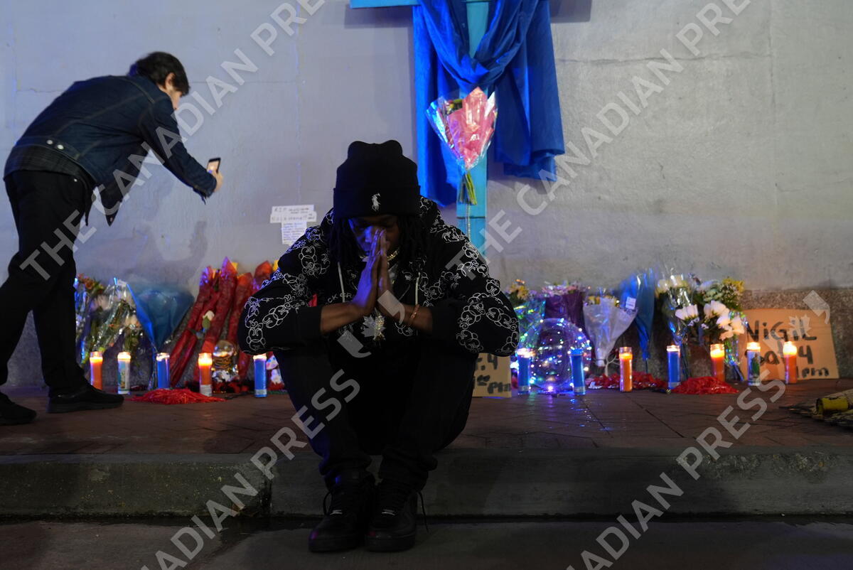 Sav Bennly sits in front of a memorial at Bourbon and Canal Street in the French Quarter, Thursday, Jan. 2, 2025 in New Orleans. (AP Photo/George Walker IV)