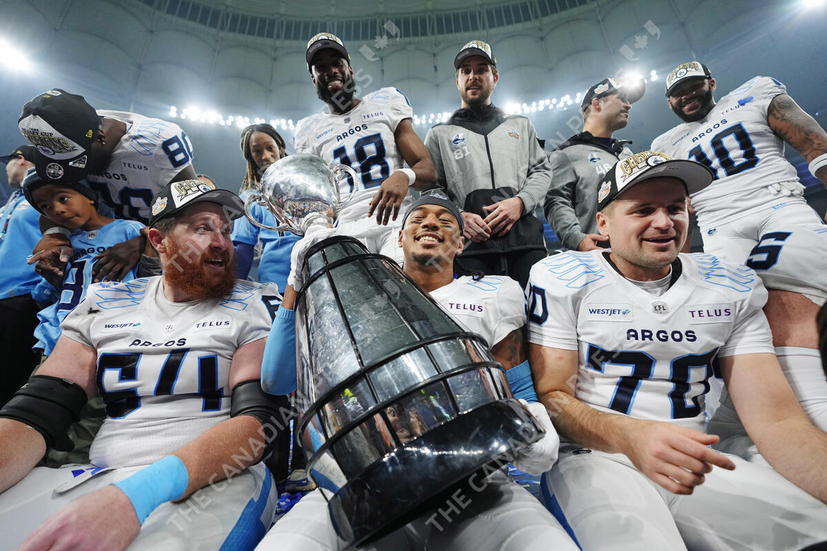 Toronto Argonauts' Royce Metchie (9) holds the Grey Cup as he poses with teammates after defeating the Winnipeg Blue Bombers in CFL football action at the 111th Grey Cup in Vancouver on Sunday, November 17, 2024. THE CANADIAN PRESS/Darryl Dyck