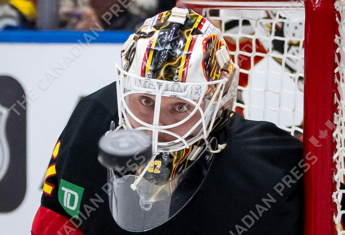 Vancouver Canucks goaltender Kevin Lankinen (32) watches the puck against the Anaheim Ducks during the third period of an NHL hockey game in Vancouver, B.C., on Wednesday, March 5, 2025. THE CANADIAN PRESS/Ethan Cairns