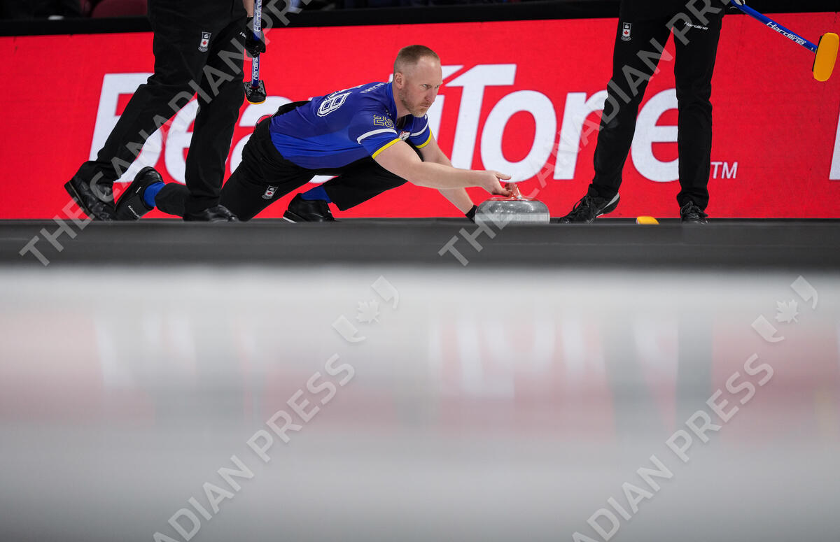 Alberta-Jacobs skip Brad Jacobs delivers a rock while playing Ontario during the Brier, in Kelowna, B.C., on Wednesday, March 5, 2025. THE CANADIAN PRESS/Darryl Dyck