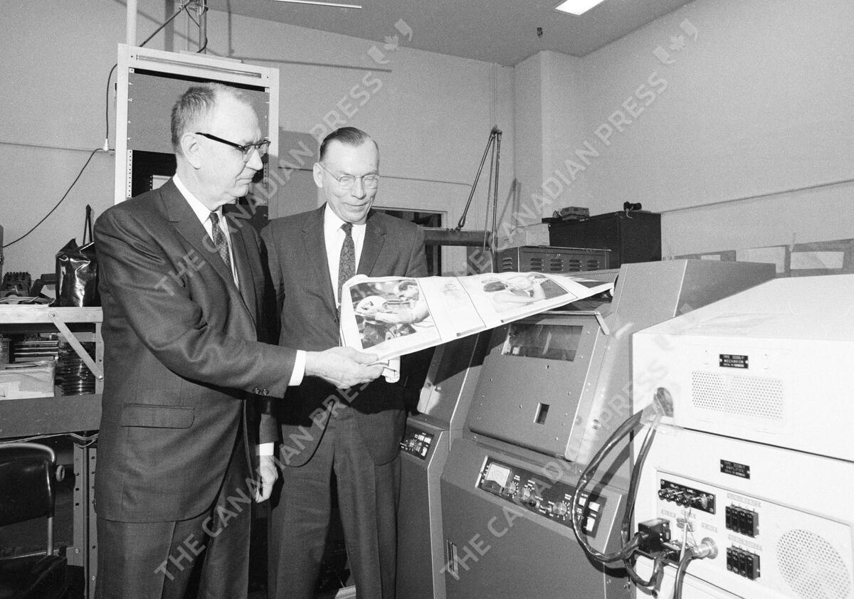 Chief engineer Charles W. Hubley, left, and his assistant, Constantin "Wally" Woloschak of the Associated Press, pose in New York, Jan. 28, 1969, with prototypes of a new automatic electrolytic WirePhoto receiver. The Photofax is electrolytic, which means it produces the picture by action of electric current on chemicals, which the K300 receiver commonly in use is photographic. (AP Photo/John Duricka)