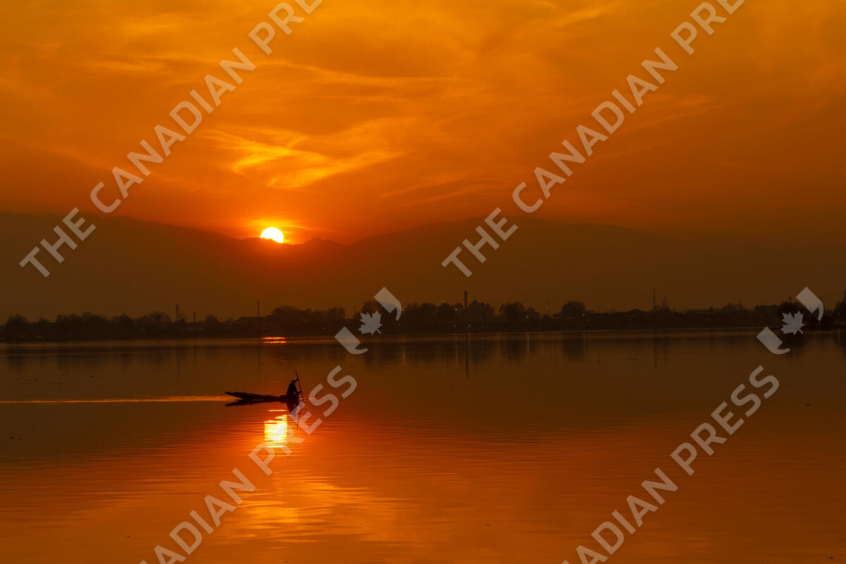 A Kashmiri fisherman rows his Shikara, or traditional wooden boat, on his way home during sunset at the Dal Lake, in Srinagar, Indian controlled Kashmir, Friday, Feb. 7, 2025. (AP Photo/Dar Yasin)