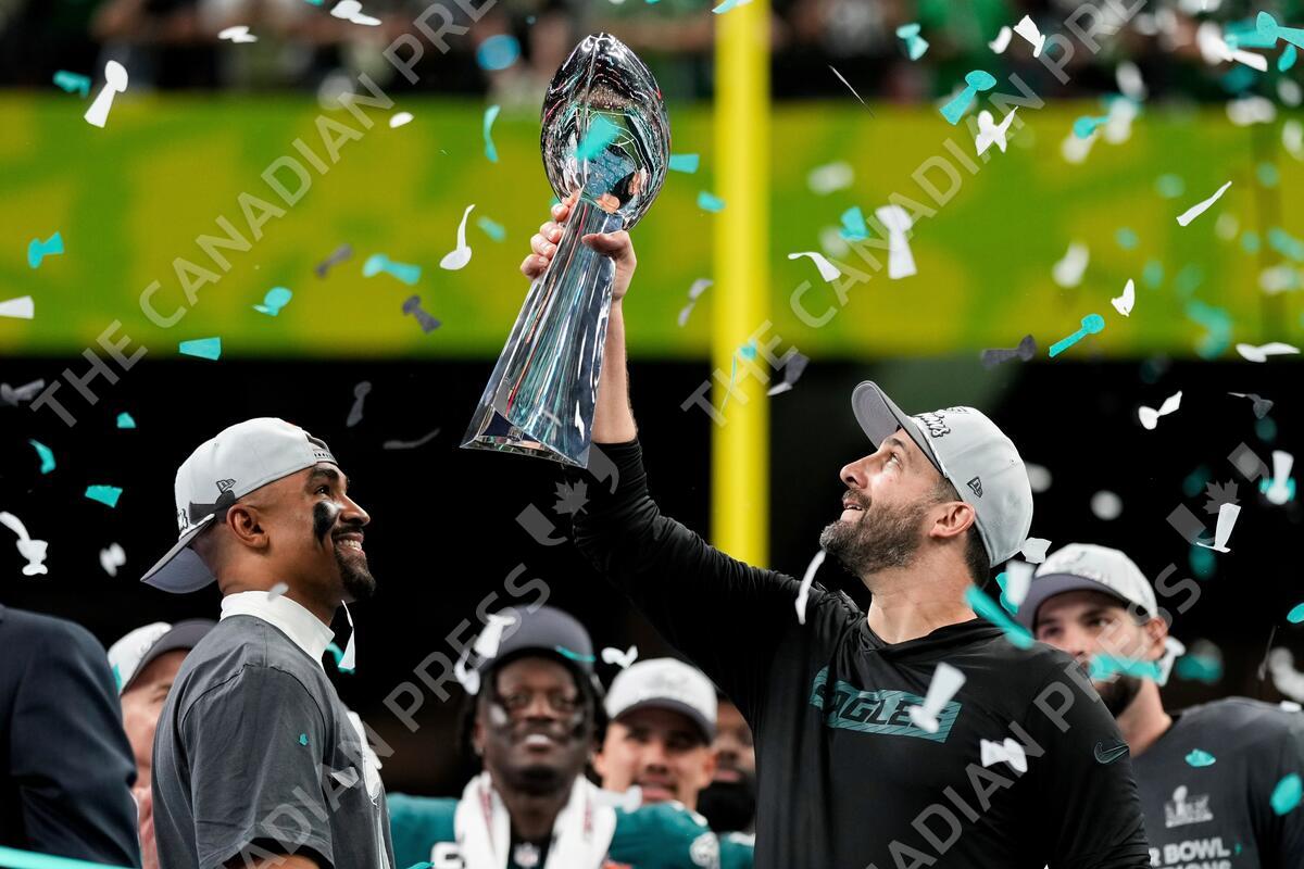 Philadelphia Eagles head coach Nick Sirianni, right, lifts the Vince Lombardi Trophy next to quarterback Jalen Hurts after defeating the Kansas City Chiefs in the NFL Super Bowl 59 football game, Sunday, Feb. 9, 2025, in New Orleans. (AP Photo/Matt Slocum)