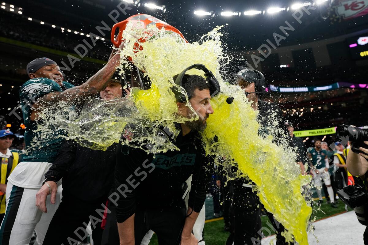 Philadelphia Eagles head coach Nick Sirianni is dunked by teammates during the second half the NFL Super Bowl 59 football game against the Kansas City Chiefs, Sunday, Feb. 9, 2025, in New Orleans. (AP Photo/Matt Slocum)