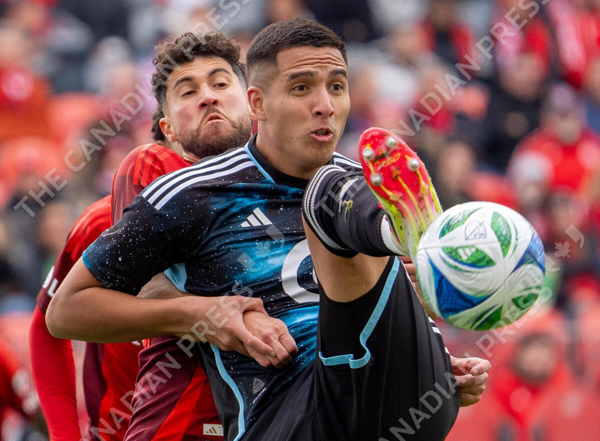 Minnesota United FC centre back Nicolas Romero, front, and Toronto FC midfielder Jonathan Osorio battle for the ball during second half MLS action in Toronto on Saturday April 12, 2025. THE CANADIAN PRESS/Frank Gunn