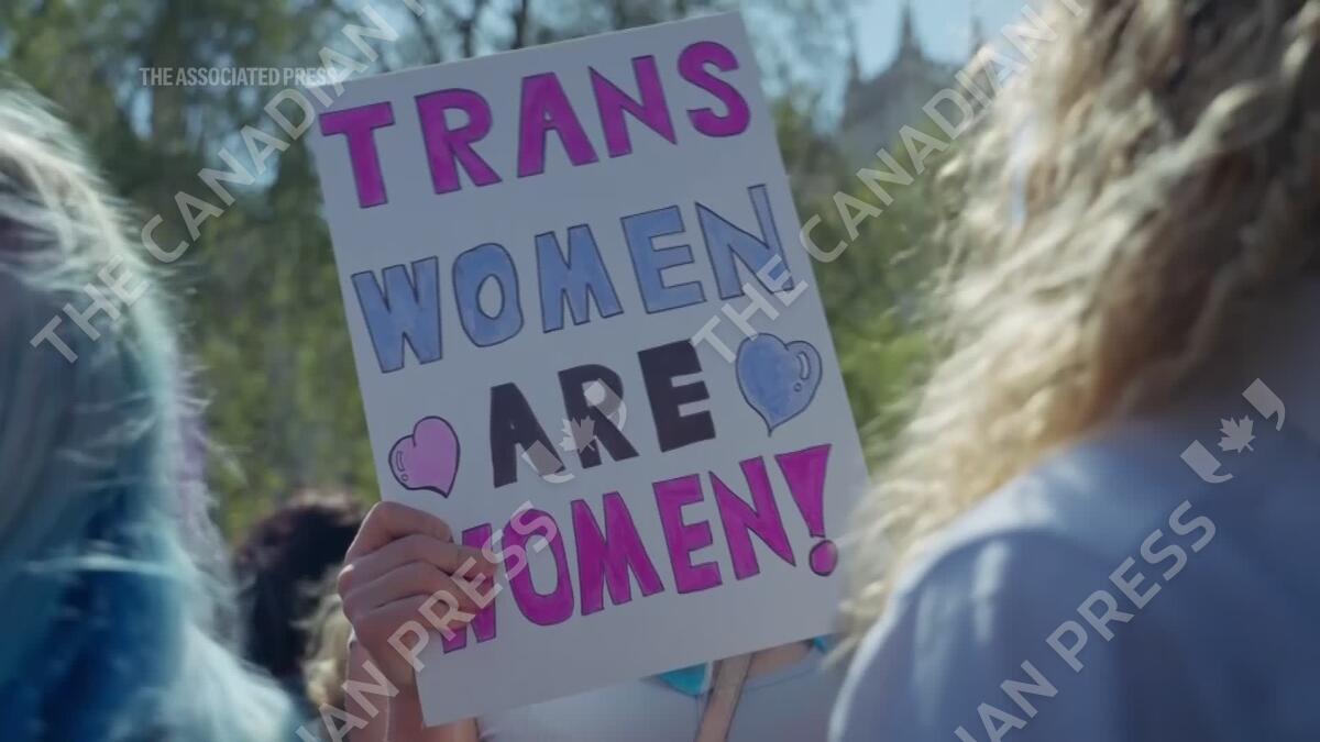 Thousands of trans rights protesters gathered in central London on Saturday, days after the U.K.'s Supreme Court ruled that a woman is someone born biologically female and that transgender women are excluded from that legal definition. (AP Video by Kwiyeon Ha)