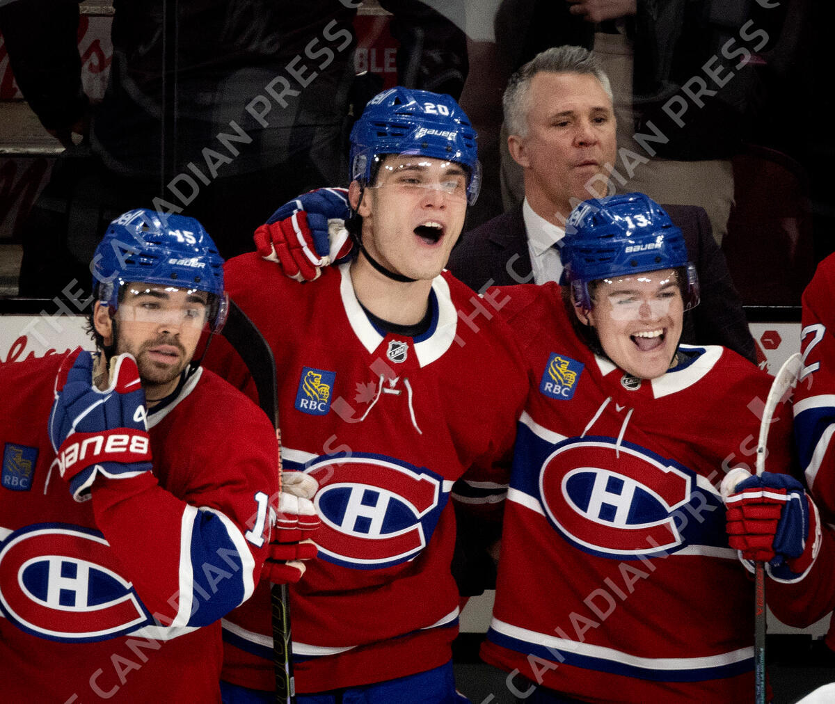 Montreal Canadiens' Alex Newhook (15), Juraj Slafkovsky (20) and Cole Caufield (13) celebrate after defeating the Carolina Hurricanes in NHL hockey action in Montreal on Wednesday, April 16, 2025. THE CANADIAN PRESS/Allen McInnis