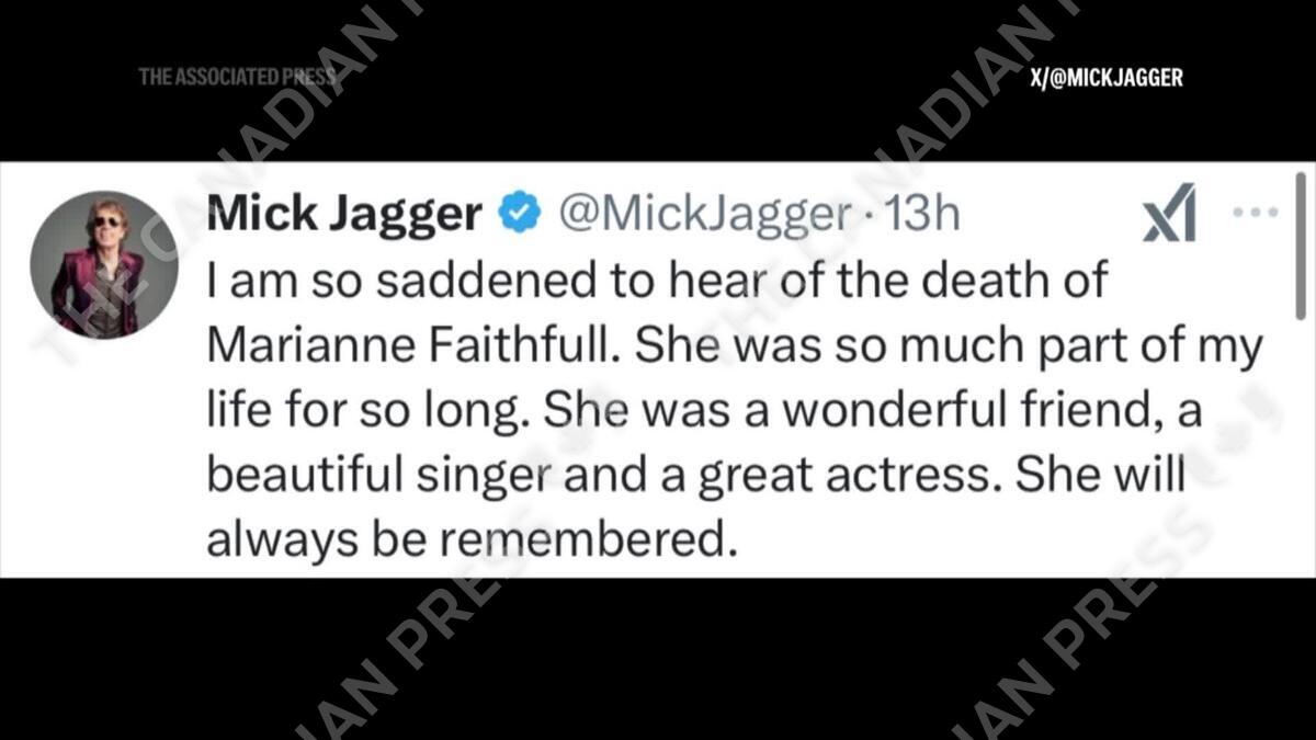 Marianne Faithfull, the British pop star, muse, libertine and old soul who inspired and helped write some of the Rolling Stones' greatest songs, died at 78 on Thursday in London. (Jan. 31)