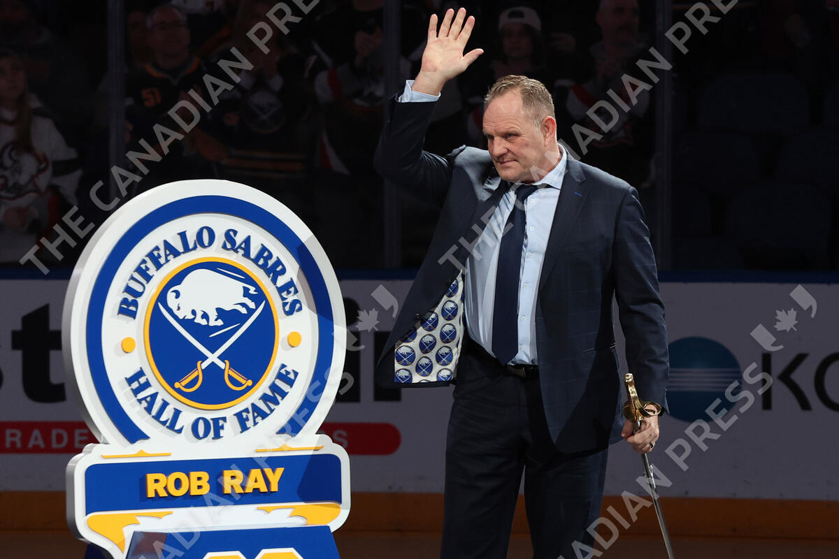 Buffalo Sabres alumni Rob Ray is inducted into the Buffalo Sabres Hall of Fame prior to an NHL hockey game against the Nashville Predators, Friday, Jan. 31, 2025, in Buffalo, N.Y. (AP Photo/Jeffrey T. Barnes)