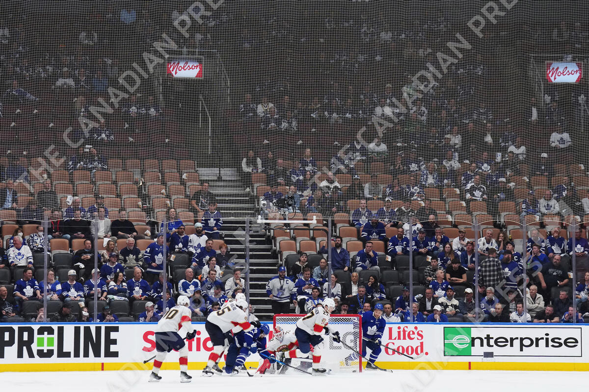 Toronto Maple Leafs' Nicholas Robertson (centre) scores on Florida Panthers goaltender Sergei Bobrovsky (72) with lots of empty seats during third period NHL playoff hockey action in Toronto on Wednesday, May 14, 2025. THE CANADIAN PRESS/Nathan Denette