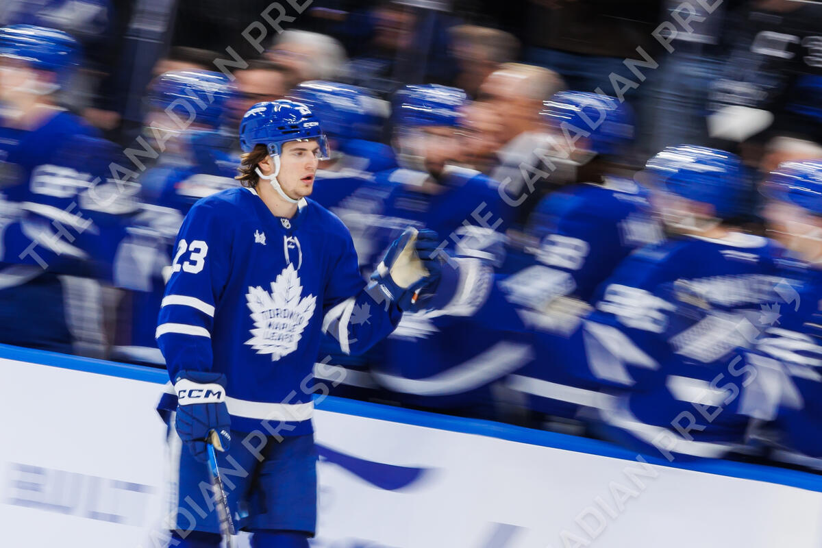 Toronto Maple Leafs Matthew Knies (23) celebrates a goal with the bench during third period NHL hockey action against the Tampa Bay Lightning, in Toronto, Monday, Jan. 20, 2025. THE CANADIAN PRESS/Cole Burston