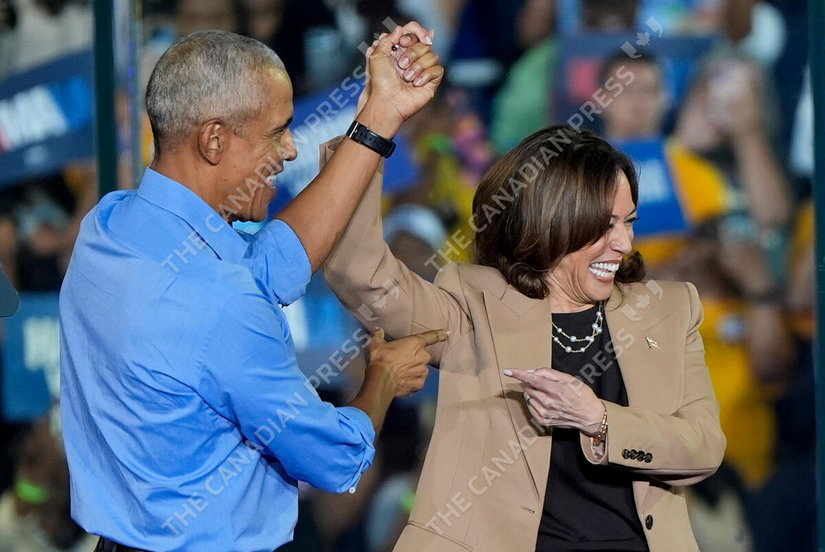 Former President Barack Obama gestures to Democratic presidential nominee Vice President Kamala Harris after introducing her to speak during a campaign rally for Harris on Thursday, Oct. 24, 2024, in Clarkston, Ga. (AP Photo/Mike Stewart)