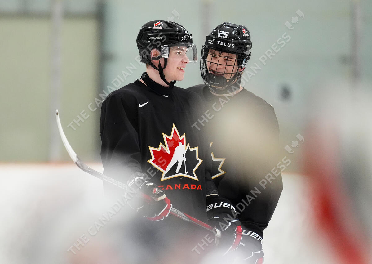 Team Canada's Oliver Bonk (5) of Ottawa and Matthew Schaefer (25) of Hamilton, Ont., share a laugh during Canada's National Junior Team training camp at the Silver Dart Arena on Canadian Forces Base (CFB) Petawawa, in Petawawa, Ont., Monday, Dec. 16, 2024. THE CANADIAN PRESS/Sean Kilpatrick