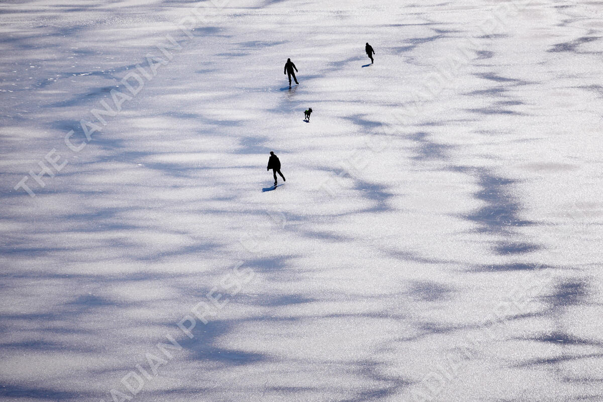 People skate on a frozen river Otava near the Zvikov Castle, Czech Republic, Wednesday, Feb. 19, 2025. (AP Photo/Petr David Josek)