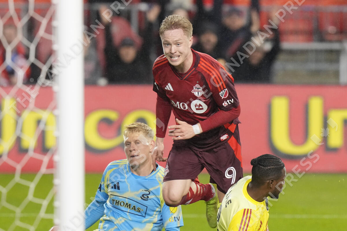 Toronto FC's Ola Brynhildsen (9) celebrates in front of Philadelphia Union defender Jakob Glesnes and goalkeeper Andre Blake after scoring during second half MLS action in Toronto, on Wednesday, May 28, 2025. THE CANADIAN PRESS/Chris Young