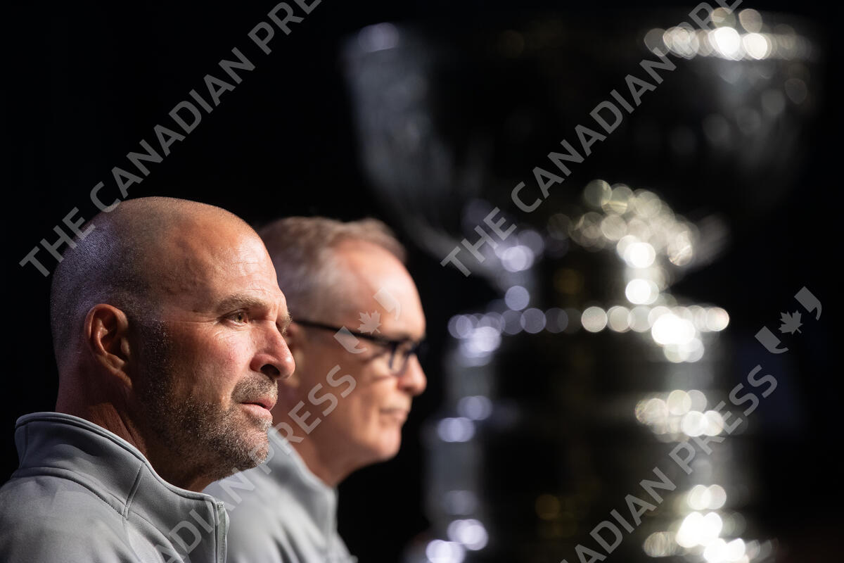 Florida Panthers' general manager Bill Zito, left, and head coach Paul Maurice speak to media before game 1 of the Stanley Cup finals against the Edmonton Oilers, in Edmonton on Tuesday, June 3, 2025. THE CANADIAN PRESS/Jason Franson
