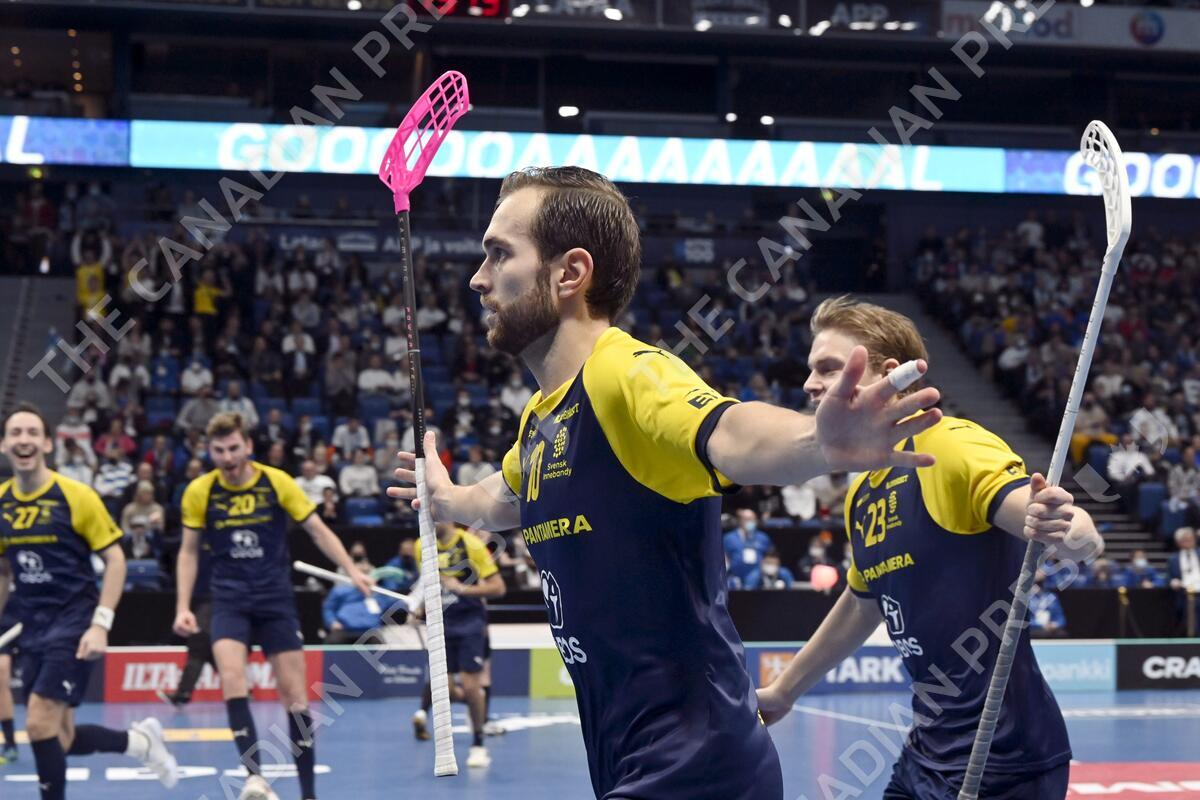 Albin Sjögren (L) of Sweden celebrates with Hampus Ahren after scoring the team's fourth goal during the men's floorball world championships final match between Finland and Sweden in Helsinki, Finland, on December 11, 2021. LEHTIKUVA / MARKKU ULANDER - FINLAND OUT. NO THIRD PARTY SALES.