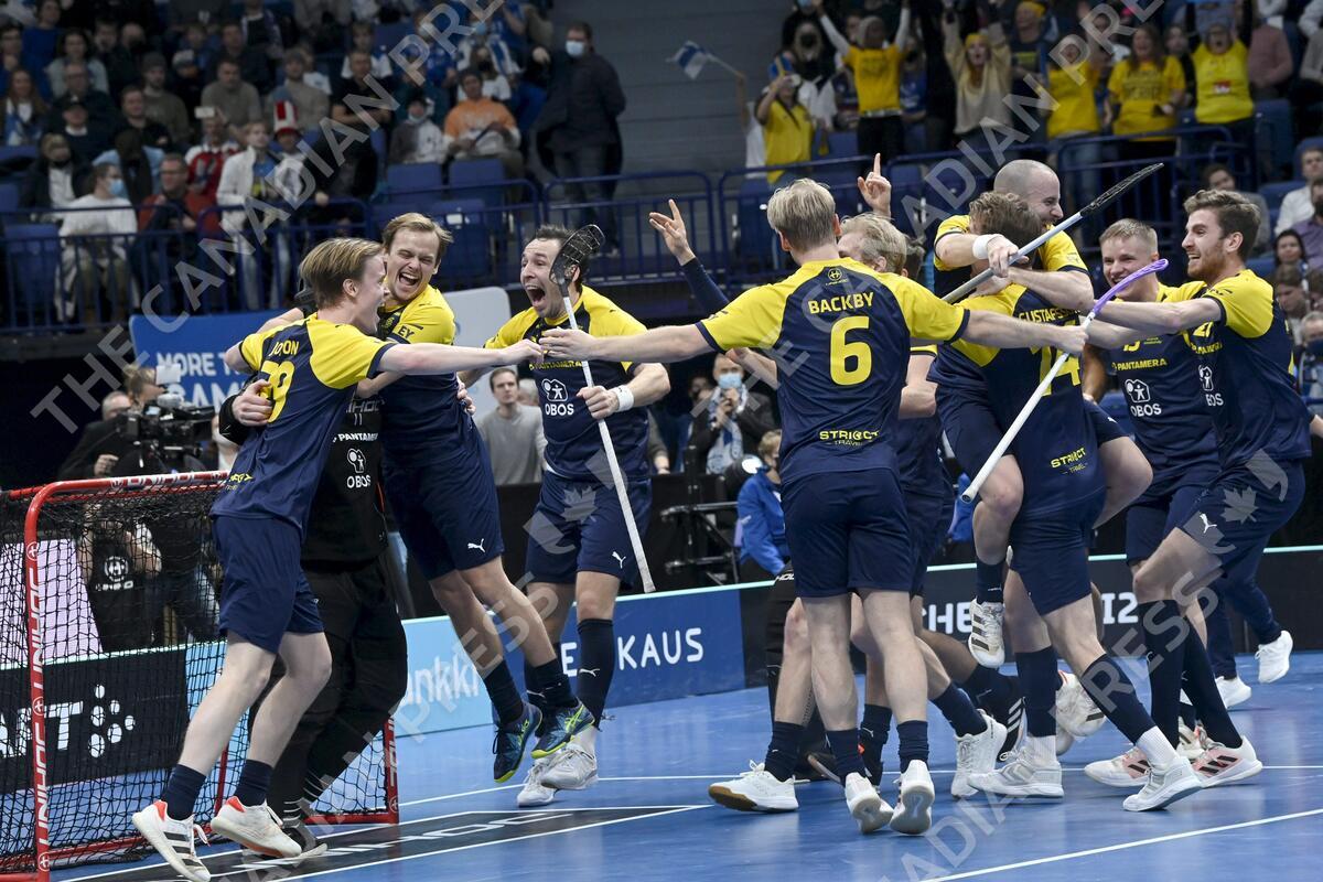 Swedish players celebrate their 6-4 victory after the men's floorball world championships final match between Finland and Sweden in Helsinki, Finland, on December 11, 2021. LEHTIKUVA / MARKKU ULANDER - FINLAND OUT. NO THIRD PARTY SALES.