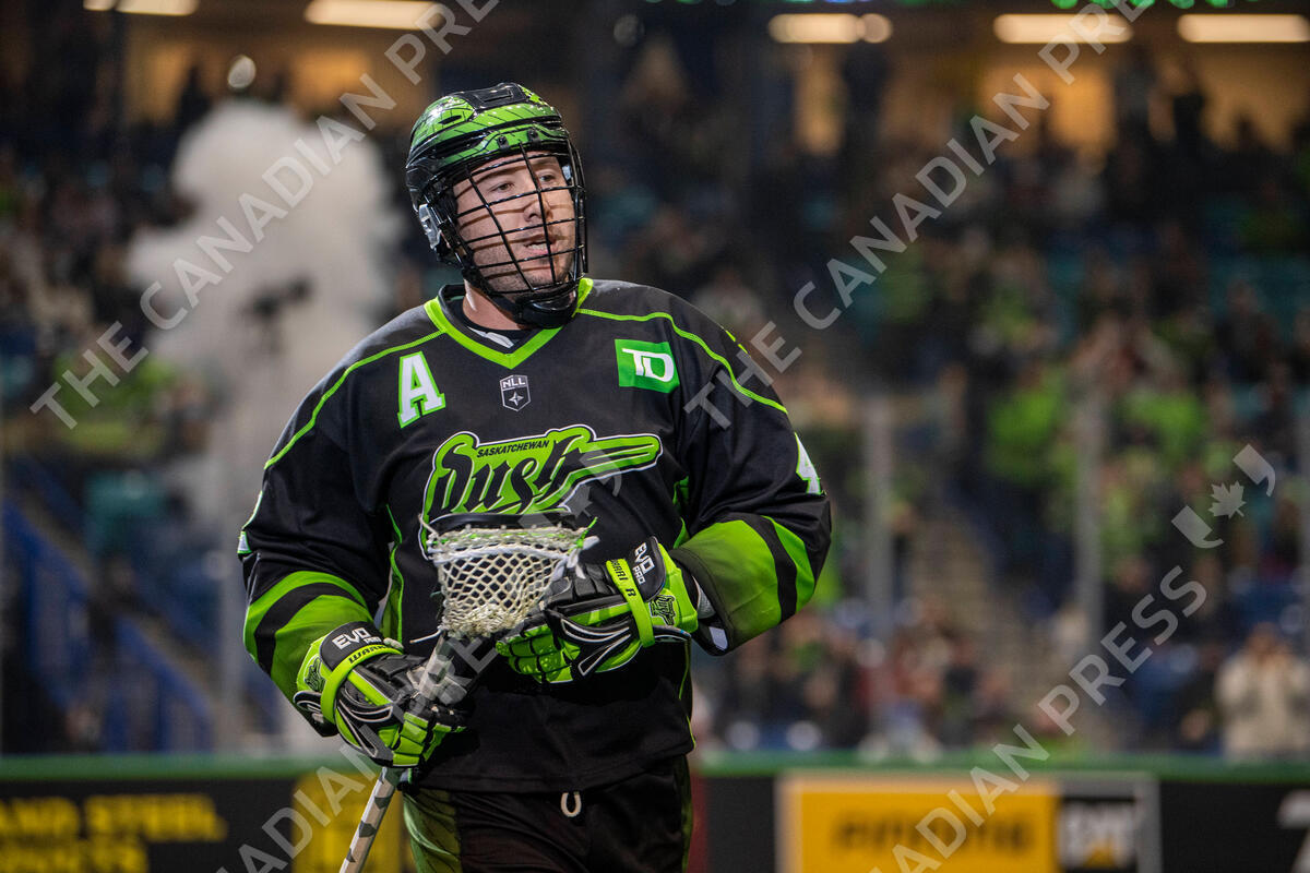 Saskatchewan Rush forward Mark Matthews celebrates a goal against the Calgary Roughnecks in National Lacrosse League action in Saskatoon, Saturday, December 11, 2021. The Rush have not hosted a game in Saskatoon since March 7, 2020 due to COVID-19. THE CANADIAN PRESS/Liam Richards