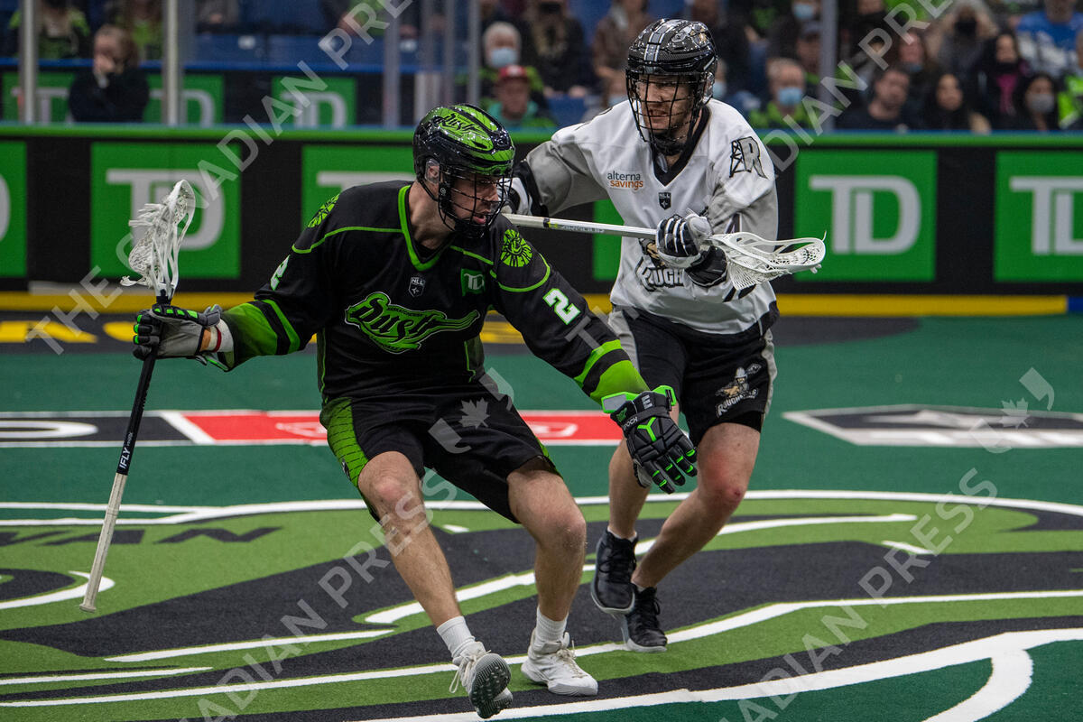 Saskatchewan Rush defender Matt Beers moves the ball away from Calgary Roughnecks defender Andrew Mullen in National Lacrosse League action in Saskatoon, Saturday, December 11, 2021. The Rush have not hosted a game in Saskatoon since March 7, 2020 due to COVID-19. THE CANADIAN PRESS/Liam Richards