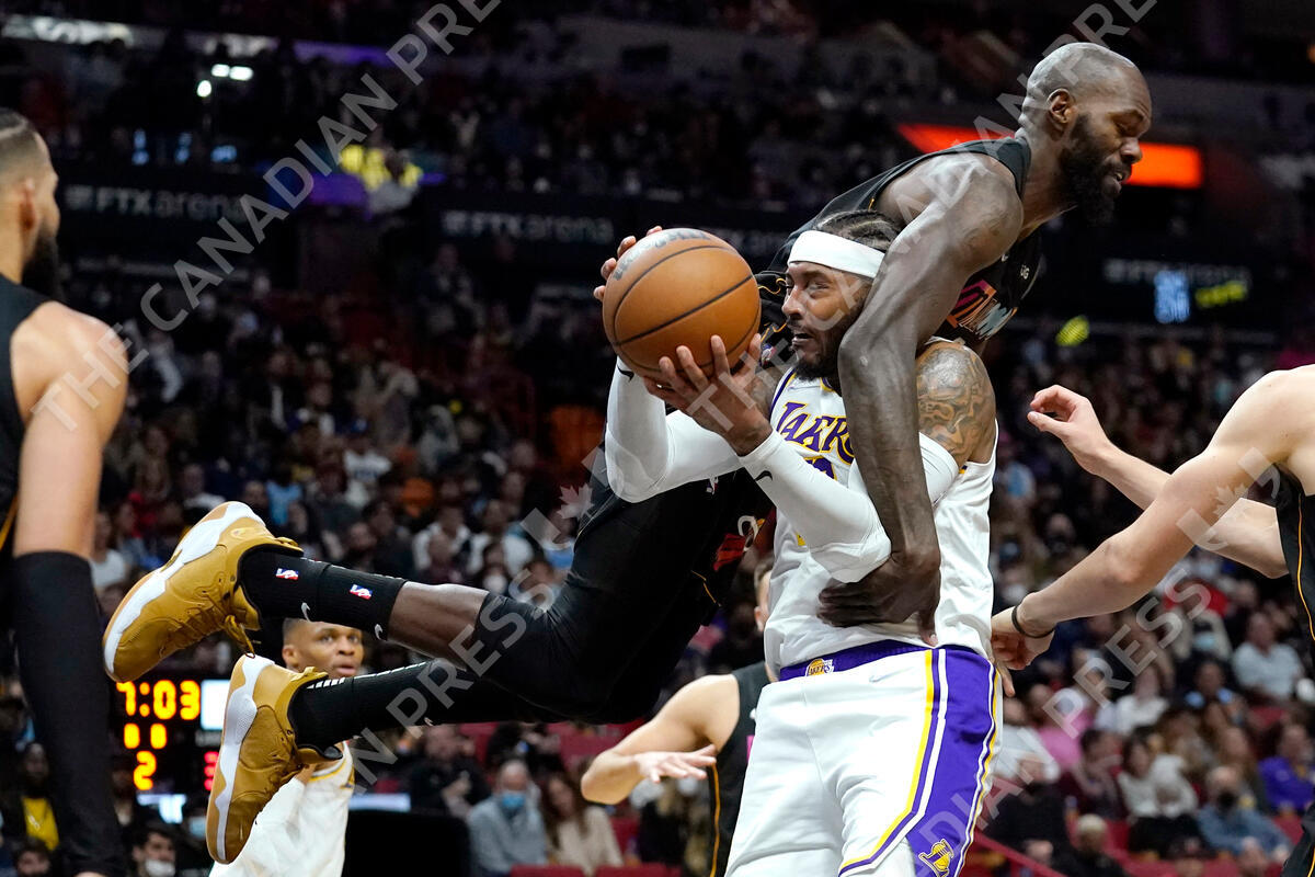 Miami Heat center Dewayne Dedmon, top, defends Los Angeles Lakers forward Carmelo Anthony during the first half of an NBA basketball game, Sunday, Jan. 23, 2022, in Miami. (AP Photo/Lynne Sladky)