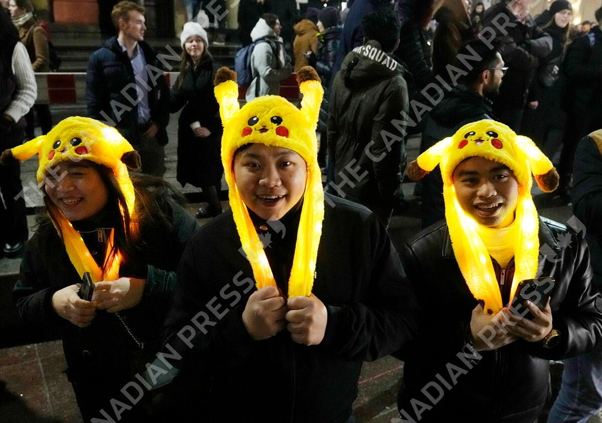 People, wearing Pikachu hats, celebrate the New Year in Warsaw, Poland, Saturday Jan. 1, 2022. (AP Photo/Czarek Sokolowski)