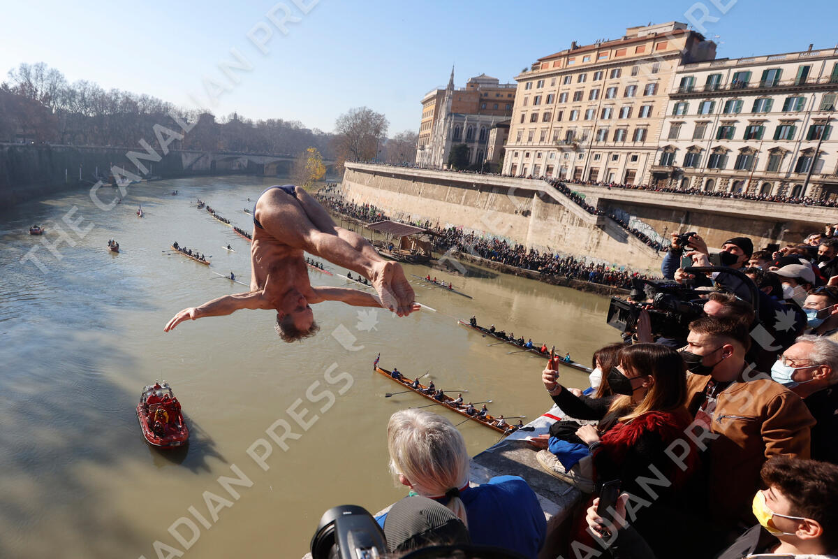 Marco Fois, of Italy, dives into the Tiber river from the 18 meter (59 feet) high Cavour Bridge to celebrate the New Year Day in Rome, Saturday, Jan. 1, 2022. (AP Photo/Riccardo De Luca)