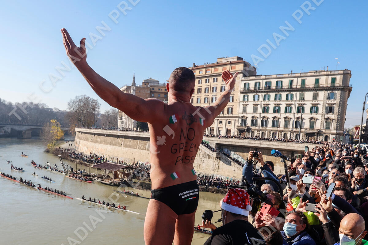 Simone Carabella, of Italy, with the slogan 'No Green Pass' painted on his back, greets people as he prepares to dive into the Tiber river from the 18 meter (59 feet) high Cavour Bridge to celebrate the New Year Day in Rome, Saturday, Jan. 1, 2022. (AP Photo/Riccardo De Luca)