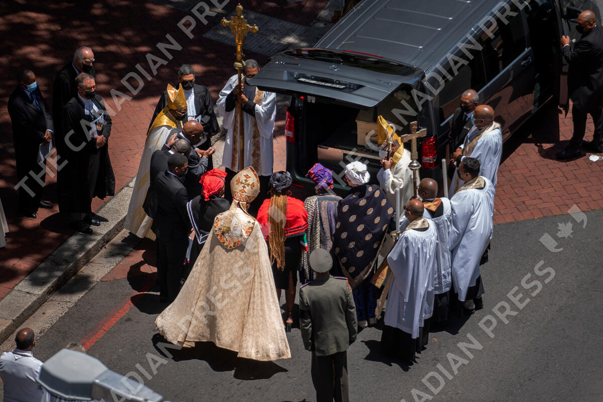 Relatives stand in front of the casket carrying the remains of Anglican Archbishop Emeritus Desmond Tutu after it was put in a hearse following his funeral service at the St. George's Cathedral in Cape Town, South Africa, Saturday, Jan.1, 2022. Tutu, the Nobel Peace Prize-winning activist for racial equality and LGBT rights died Sunday at the age of 90. (AP Photo/Jerome Delay)