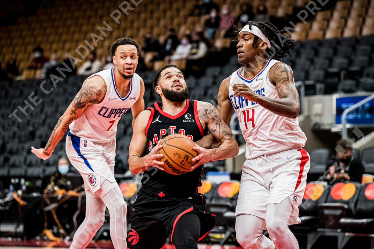 Toronto Raptors guard Fred VanVleet (23) is defended by LA Clippers guard Amir Coffey (7) and Terance Mann (14) during second half NBA action, in Toronto, on Friday, Dec. 31, 2021. THE CANADIAN PRESS/Chris Katsarov