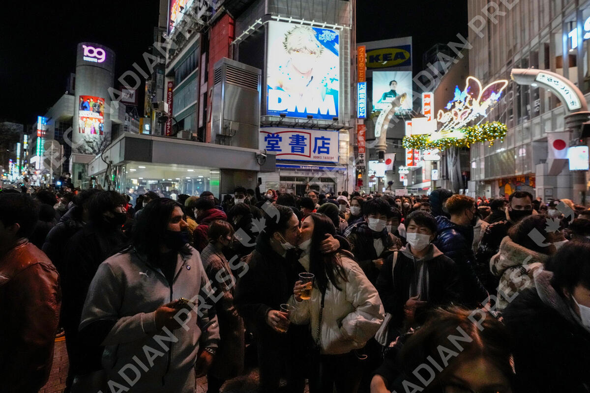A couple kiss as people celebrate the arrival of the new year at the famed Shibuya scramble crossing intersection, a popular location for the New Year's Eve gathering, Saturday, Jan. 1, 2022, in Tokyo, though the official countdown event was cancelled. (AP Photo/Kiichiro Sato)