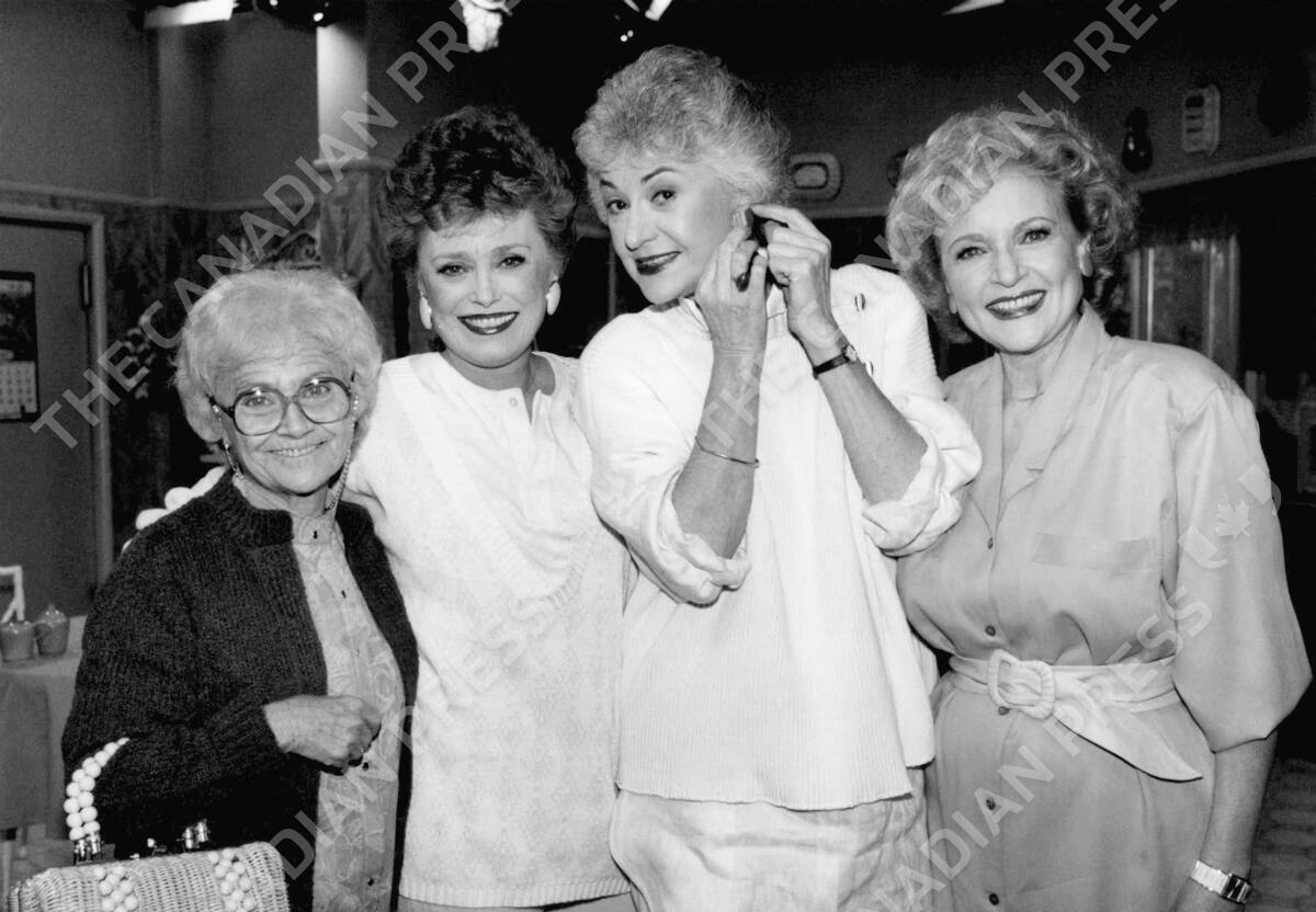 FILE - Actors from the television series "The " Golden Girls" stand together during a break in taping Dec. 25, 1985 in Hollywood. From left are, Estelle Getty, Rue McClanahan, Bea Arthur and Betty White. Betty White, whose saucy, up-for-anything charm made her a television mainstay for more than 60 years, has died. She was 99. (AP Photo/Nick Ut, File)