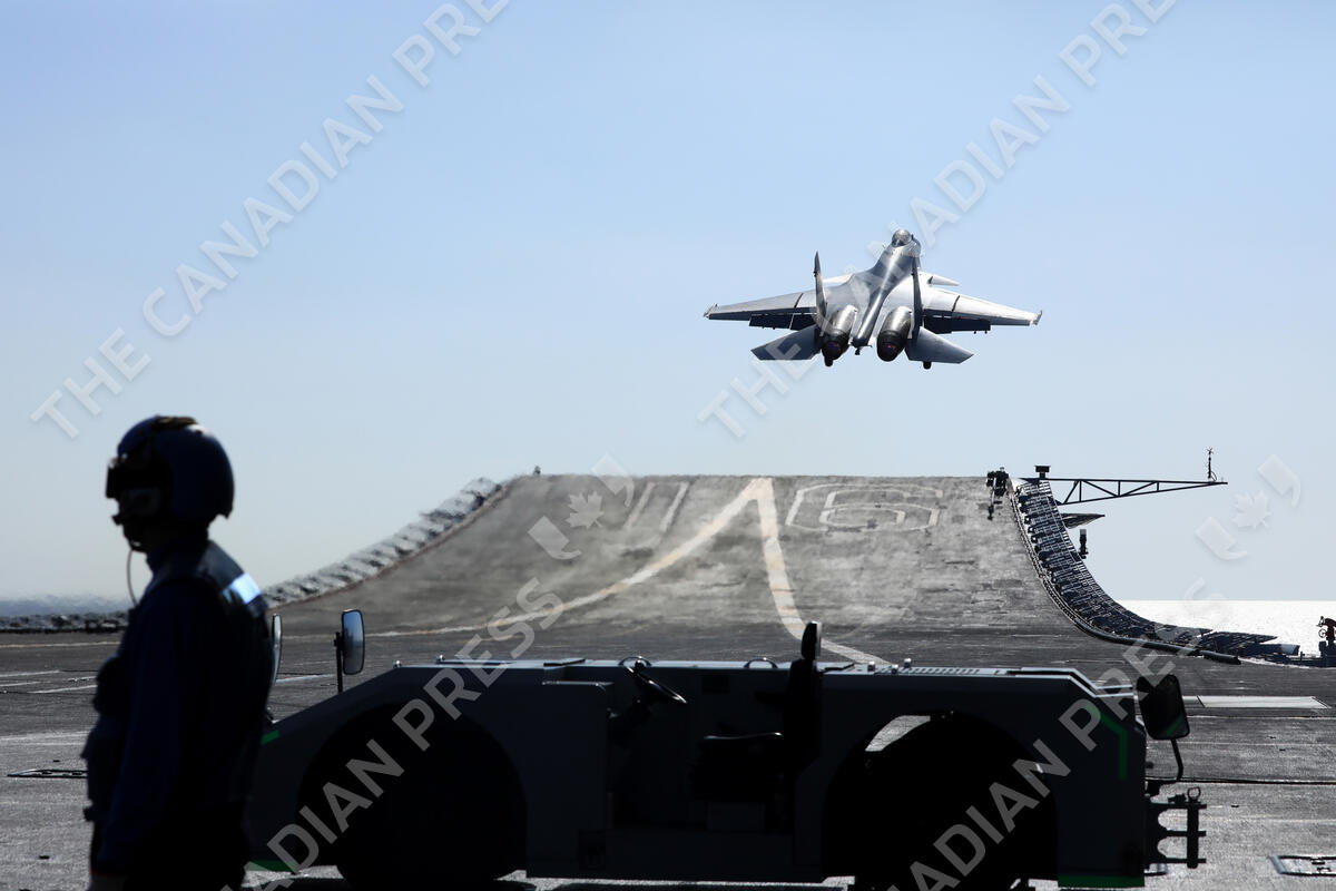 BEIJING, Dec. 31, 2021 Undated file photo shows a carrier-based J-15 fighter jet taking off during open-sea combat training. The Chinese navy's Liaoning aircraft-carrier formation returned on Dec. 30, 2021 to a military port in Qingdao, east China's Shandong Province, concluding 20-plus days of open-sea combat training.. The exercise, which began on Dec. 9, took the formation into various waters, from the Yellow Sea to the East China Sea and the West Pacific, and has improved the formation's combat capability, according to an official statement. (Credit Image: © Hu Shanmin/Xinhua via ZUMA Press)