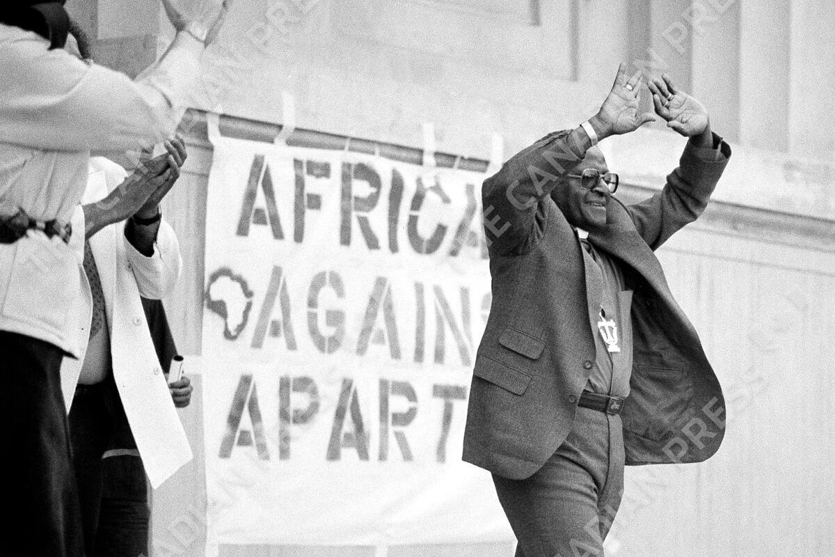 FILE - Desmond Tutu greets a crowd of 10,000 people with his hands held high during a rally at the Greek Theater on the University of California at Berkeley, Calif., campus, May 14, 1985. Tutu praised the students for their opposition to apartheid in South Africa. (AP Photo/Eric Risberg, File)