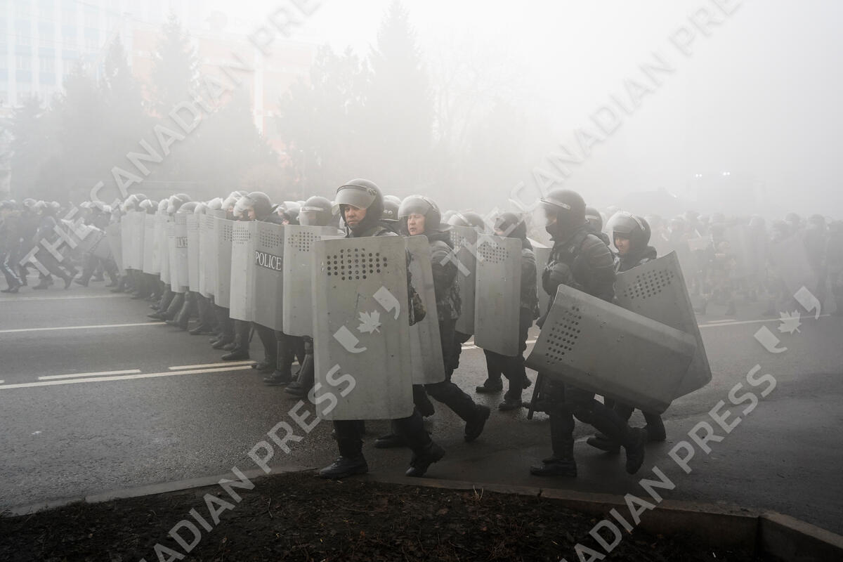 Riot police walk to block demonstrators during a protest in Almaty, Kazakhstan, Wednesday, Jan. 5, 2022. Demonstrators denouncing the doubling of prices for liquefied gas have clashed with police in Kazakhstan's largest city and held protests in about a dozen other cities in the country. (AP Photo/Vladimir Tretyakov)