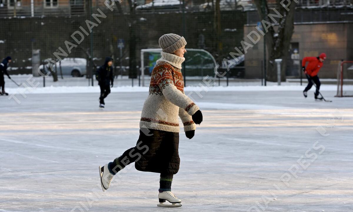 A woman skates in Helsinki, Finland, on a sunny but frosty Boxing Day December 26, 2021, with the temperature at around 13 degrees below zero (Centigrade). LEHTIKUVA / HEIKKI SAUKKOMAA - FINLAND OUT. NO THIRD PARTY SALES.