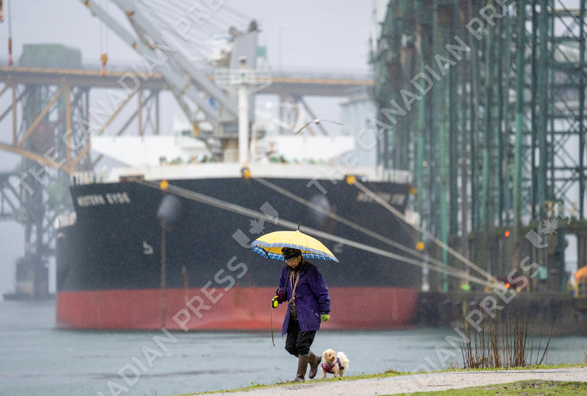 A pedestrian uses an umbrella to shield themselves from the heavy rain as they walk along the shore of the harbour in Vancouver Tuesday, January 11, 2022. THE CANADIAN PRESS/Jonathan Hayward