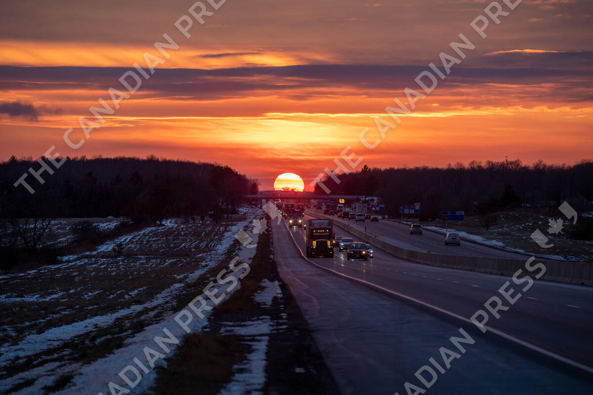 The sun sets along highway 401 on the Winter solstice near Belleville, Ontario on Tuesday December 21, 2021. THE CANADIAN PRESS IMAGES/Lars Hagberg
