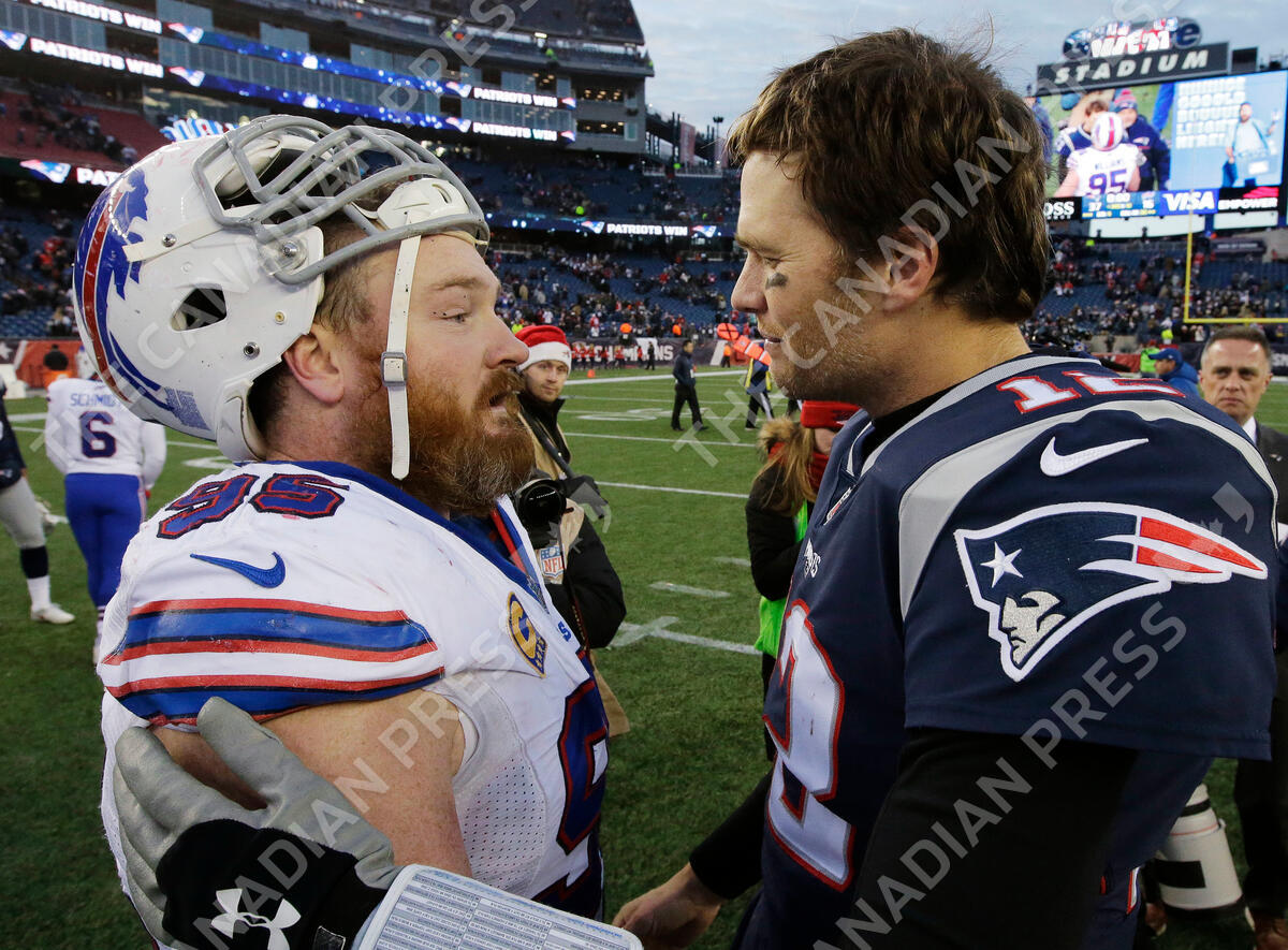 FILE - Buffalo Bills defensive tackle Kyle Williams, left, and New England Patriots quarterback Tom Brady, right, speak at midfield after an NFL football game, Sunday, Dec. 24, 2017, in Foxborough, Mass. The Patriots beat the Bills 37-16. (AP Photo/Steven Senne, File)