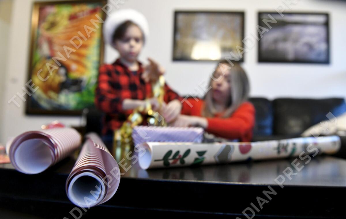 Family wraps up the Christmas presents at home in Espoo, Finland on 19th December, 2021. LEHTIKUVA / HEIKKI SAUKKOMAA - FINLAND OUT. NO THIRD PARTY SALES.
